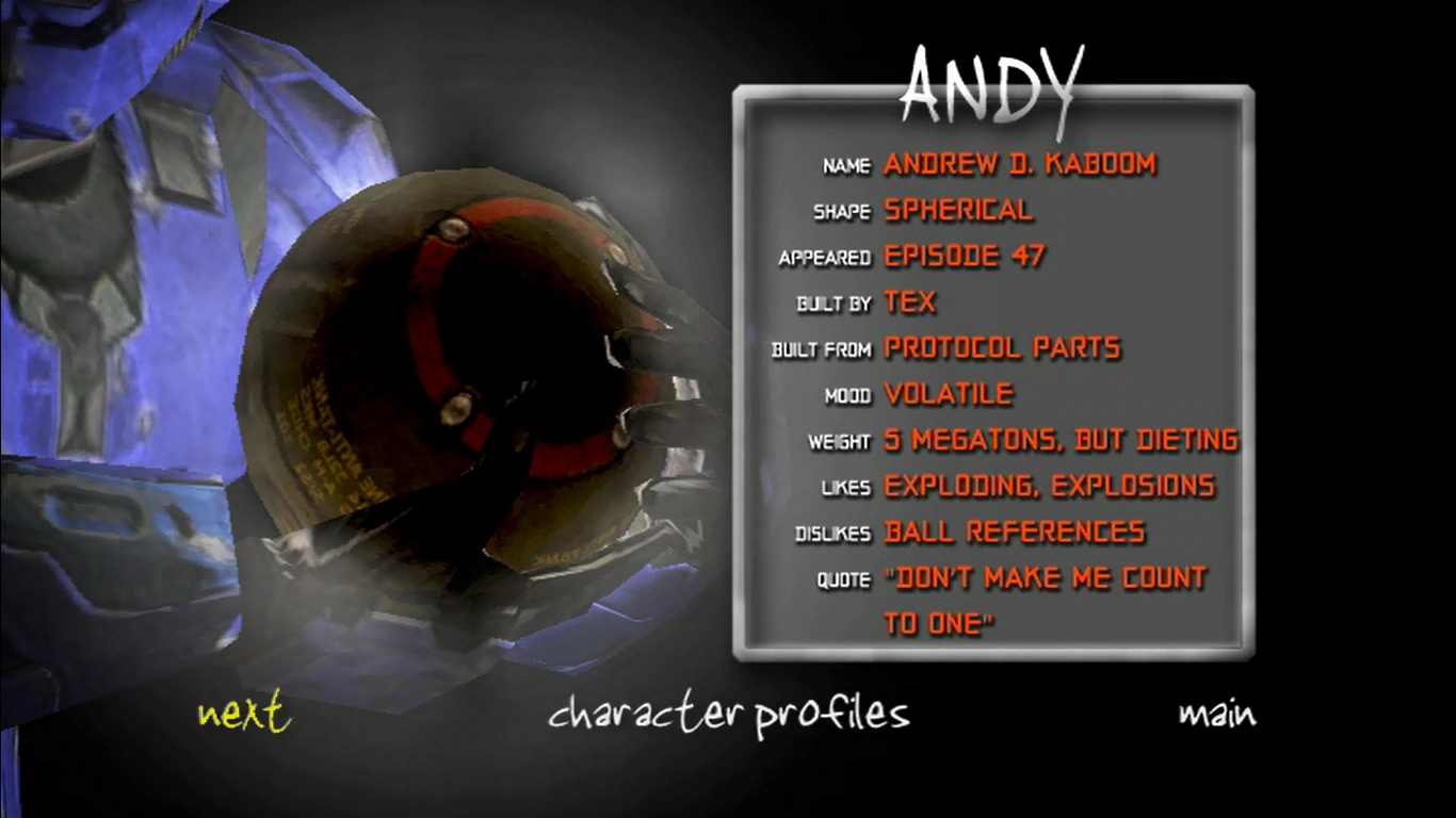 Being a bomb, Andy was specifically designed to destroy Omega and his fortress, suggesting he has a large blast radius. He uses this to threaten other characters to make them do what he says, which works most of the time. Eventually, the Reds used him to prevent Omega's plan to succeed, as he detonates on board the Pelican when it takes flight in Why Were We Here?. Even though he heavily damages the airship, he doesn't kill anyone on board and seems to be disappointed in the size of the explosion, suggesting his blast radius was smaller than expected.