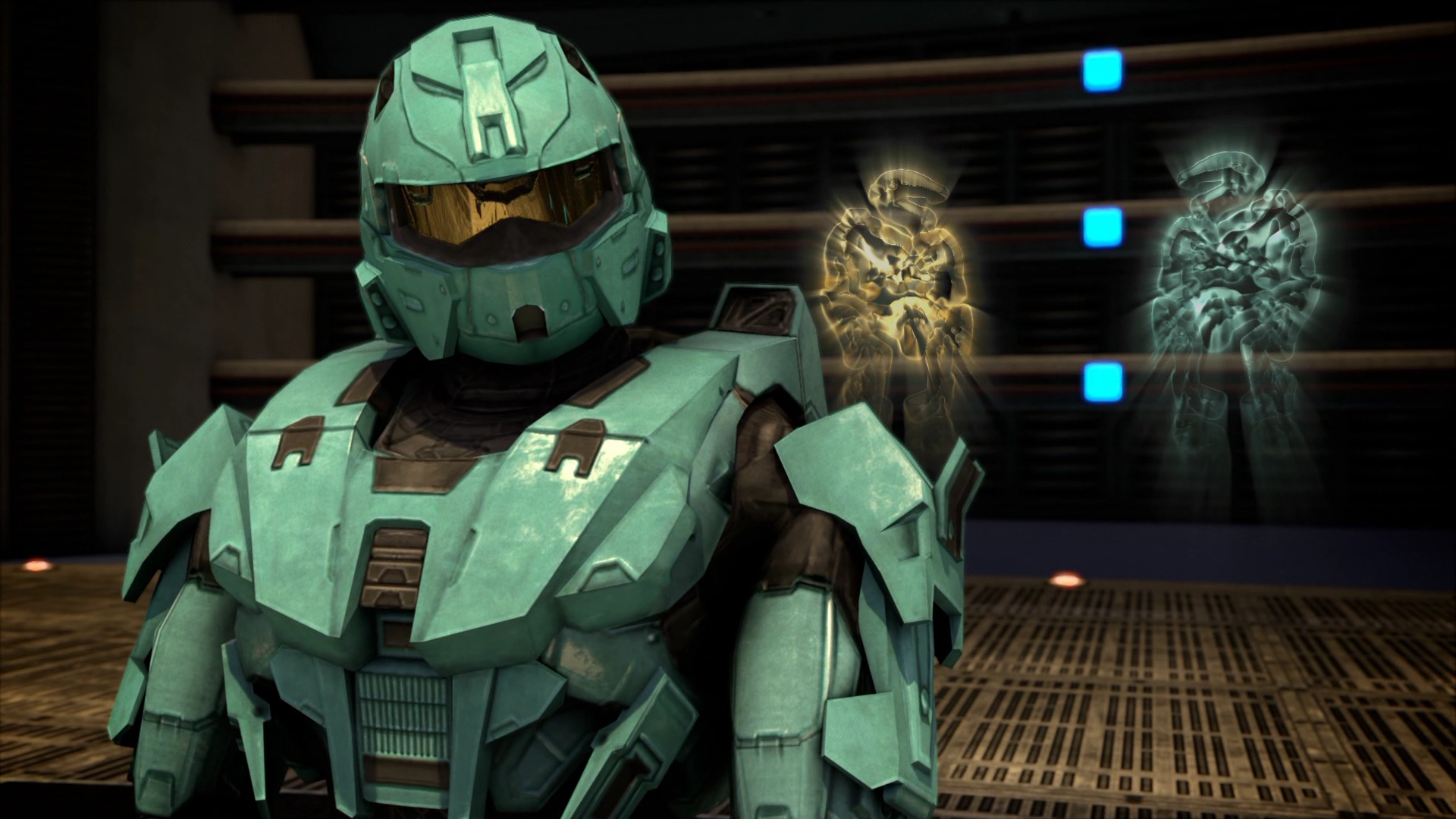 - When Carolina appears in Halo 2, her armor is the standard Mark VI, and wears tan instead of her usual cyan due to her enlistment in the UNSC.