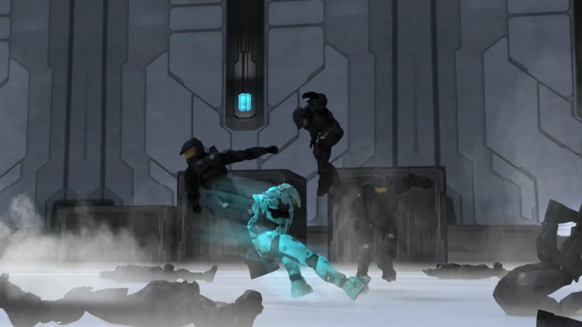 While fighting, the two weaken the observation window of the ship's bridge, causing the force of the blows to send it into the atmosphere. The ship then crash-lands on a frozen planet, where Carolina is ejected out of the ship through the weakened window, landing near a cliff. Agent Maine, now the Meta, soon approaches her and forcibly removes her two A.I., Eta and Iota, before tossing her off the cliff. However, Carolina manages to save herself by using her grappling gun, leading everyone to believe that she died in the fall.