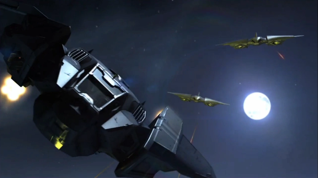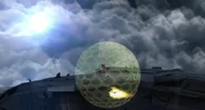 North Dakota collapses back into the loading bay in critical condition. A yellow beam is shot in the distance, destroying one of the Longswords.