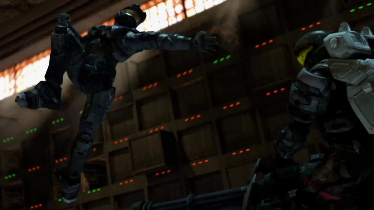 The Demo Man runs up behind Carolina and punches her down with his robotic arm. Carolina gets up, noticing that one of her plasma rifles was badly damaged. Discarding the broken weapon, she raises her other rifle only for it to be hit with a machete. The thrower is revealed to be the Female soldier.