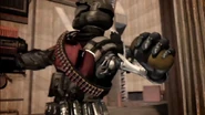 Maine begins charging at him but is sent flying by the Demo Man into Carolina, who was still fighting Girlie. Carolina immediately gets up and charges again, while Maine jumps for his Brute Shot. He then fires a round but the Demo Man catches it and tosses it back towards him. The round explodes, briefly obscuring Maine from view. The smoke clears as Maine throws his Brute Shot at the Demo Man, severing his robotic arm with the bladed edge.
