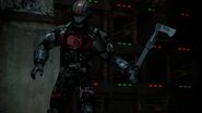 She twirls two more machetes and charges at Carolina. Carolina dodges and throws the plasma rifle at her. Girlie cuts it in half and charges again. She is knocked back, and the Demo Man steps in to try and punch Carolina. Carolina backs away as the Demo Man and Girlie pursue her. Cut to the Sleeveless Insurrection Soldier, not far away, getting up. He massages his head. Looking at his right, he sees Maine, who cracks his knuckles and neck. The soldier swings his fist at Maine, only for Maine to stop it. Maine slowly starts twisting his arm, forcing him onto his knees. Maine then readies his other fist and punches him back hard enough to knock his helmet off, and knocking him out. Maine turns around to see Carolina still fighting Girlie and Demo Man on a higher platform and rushes to assist. Cut to Carolina, who dodges the machete swings and wild punches thrown by the Demo Man.