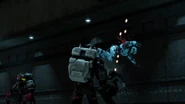 Cut to the Leader and C.T. A robotic crane moves in the background. Suddenly, the Leader stops the group. C.T turns and aims her Magnums, while the Leader pulls out a collapsible tomahawk.