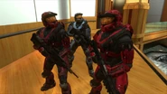Coming to inside a huge building, he finds Female-Sarge and Female-Simmons looking over him, revealing that what they're in is a renovated red base that they got after calling Command. After, Female-Grif comes out after getting awoke by her nap, and Female-Donut came in saying that she could not find headlight fluid, but found the blue team's flag. Suddenly, Tucker and Caboose arrive at red base, but not to rescue Epsilon, only to get with the red team. However, when Tucker wanted to hit up with Female-Grif as he never done it with a plus sized girl, she angrily shoots him in the lap. Eventually, the red team has captured the entire blue team, and Female-Sarge orders Female-Lopez to watch guard. However, Tex soon arrives and stabs Female-Lopez, but its soon revealed that Tex in this scenario is a man. While Epsilon is okay with that, he decides to end the scenario immediately.