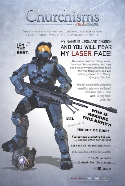 From the outset, Rooster Teeth establishes that Church is often angry.[1] Burns has said that, in this way, Church was modeled after Gustavo Sorola, who voices the character Simmons. To emphasize this trait, Caboose, for whom Rooster Teeth did not have a plan originally, was basically "a catalyst for getting Church pissed off."[6] When Church and Tex explore Caboose's Mind as ghosts, Caboose's mental image of Church, Leonard, is portrayed as over-the-top, vulgar, and Caboose's best friend.