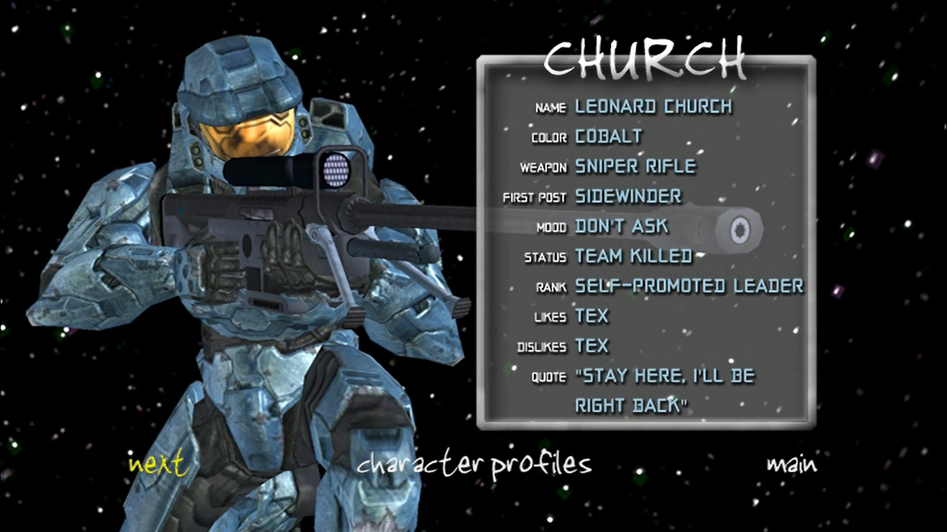 Despite being a private, a major characteristic of Church is that he's been shown to be a great leader. For example: despite Tucker being higher in rank, Church commonly leads the Blues and has also led the Reds and Blues against O'Malley's final assault. This is also shown in Reconstruction, where he seemingly takes second-in-command under Washington when the teams were pitted against the Meta. It can be assumed that he obtained this trait from the Director, as he leads an advanced military program. According to Tucker in Reconciliation, Church's leadership was him "taking the blame when shit went wrong."
