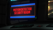 Suddenly, the room's motion detector sets off: "MOTION DETECTOR SECURITY ROOM," causing the mercenary to look around. However, the room is vacant. As the alarm continues to sound off, the mercenary turns to it and taps it, briefly turning off the alarm. However, the alarm sets off again, prompting the mercenary to look around the room once again. The mercenary then reaches for the alarm, when suddenly, his radio activates, surprising him.