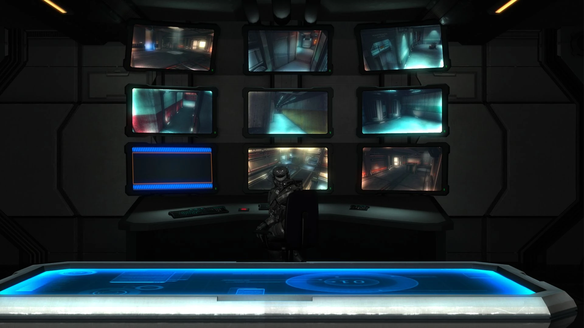 Open in on the interior of a security room. A mercenary is seen relaxing at his post.