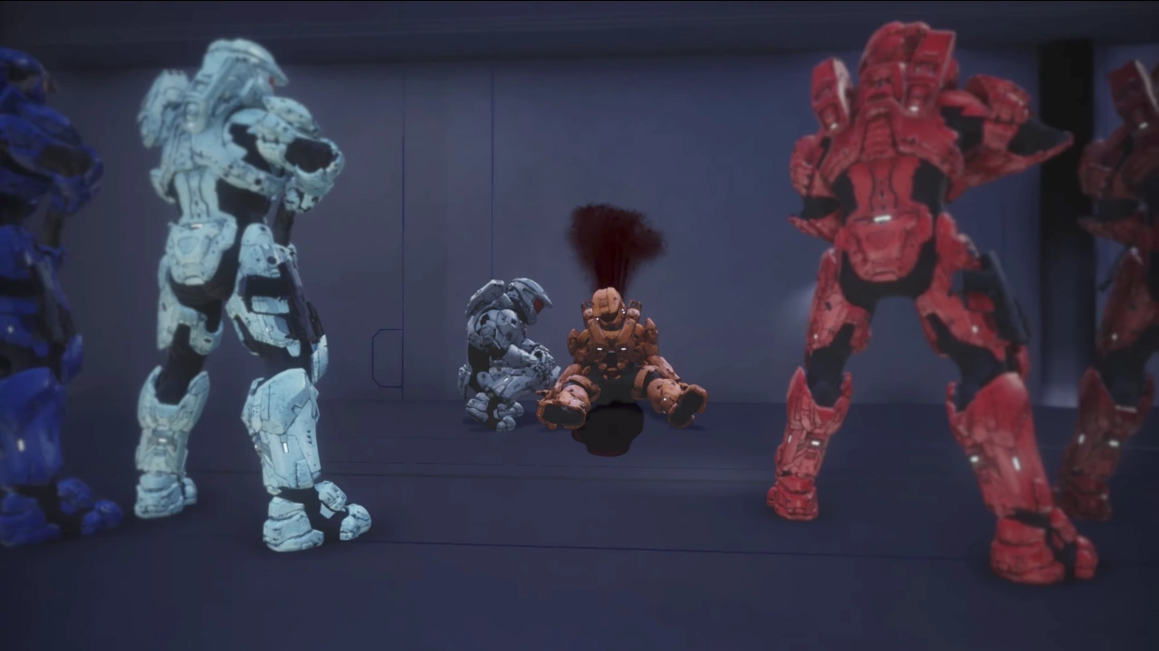 Temple watches with both Red and Blue Team as Biff dies after being stabbed by Carolina