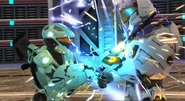 Meta uses the Brute Shot to attack, but Carolina blocks the attacks although Meta kicks her away. Meta then attacks Carolina's head, but she blocks it and shoots at Meta's head. Meta counters and headbutts Carolina, throwing her pistol away. Meta then tries to hit Carolina but she dodges it and pulls out her Humbler Stun Device. Both Meta and Carolina charge at each other. Meta tries to hit Carolina but she blocks it and stuns Meta multiple times, knocking his Brute Shot away with an air kick. Meta then sees his fallen Brute Shot, instead of picking it up, he growls and punches his fists together and walks towards Carolina as he tries to punch her many times but Carolina dodges them as she stuns Meta and kicks him down.