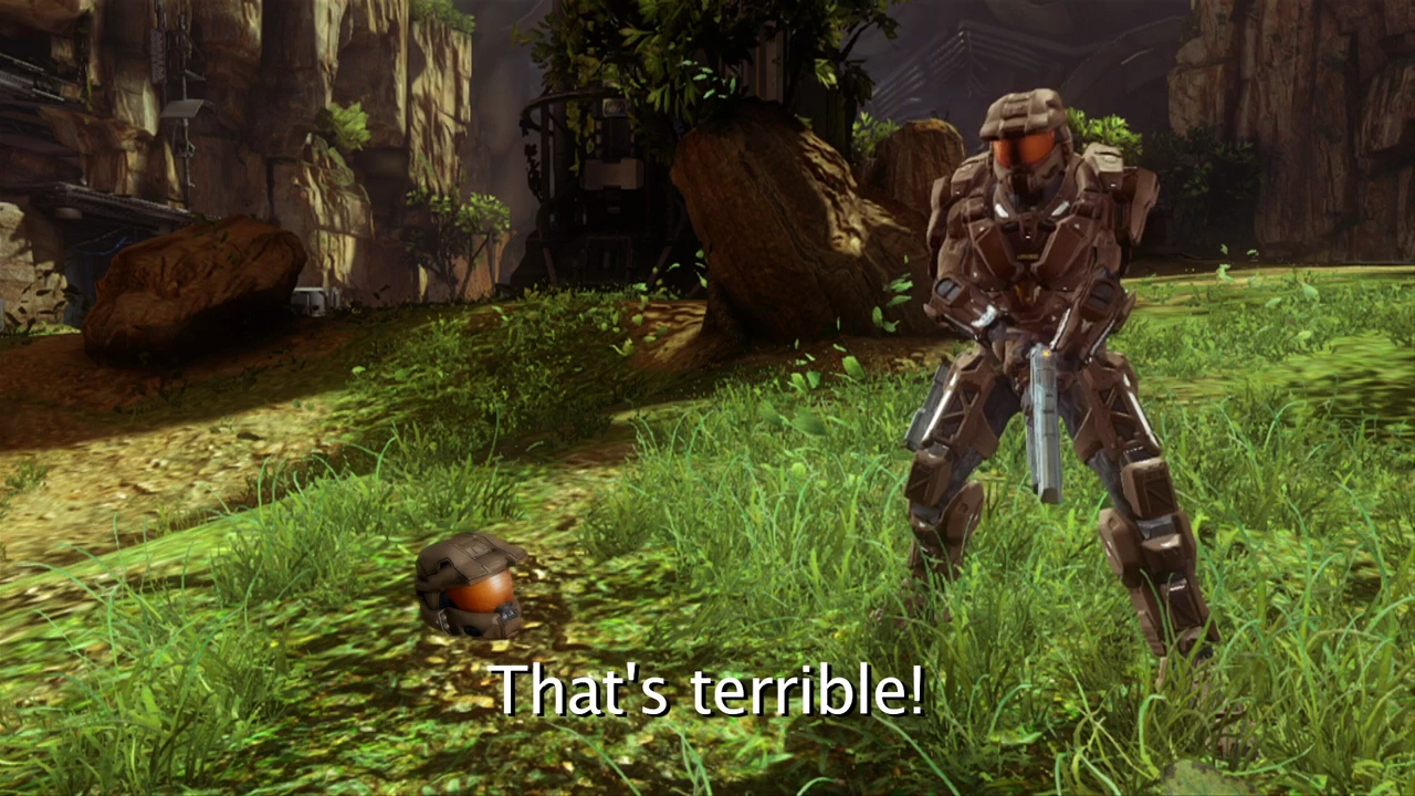 The helmet is heard shorting out. Cut to Caboose with a black visor.