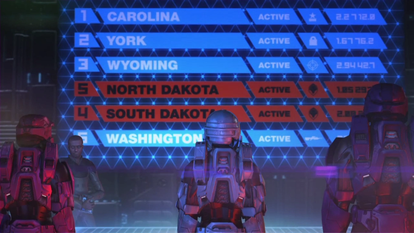 In the past, aboard the Mother of Invention control room, the Director explains to Freelancers South, North, and Carolina about the data chip. He reveals that it contained coordinates to a major target for Project Freelancer, and proceeds to change the leaderboard; placing North in 4th place and South in 5th place. South angrily takes off her helmet and tells the Director she thought the mission was a success. The Director, in return, tells South that because of her lack of stealth, a mission objective, she made their next mission more difficult. He dismisses them and South walks away angrily, punching a door control on her way out. Carolina asks North if she should speak to her, to which North suggests to give her a minute.