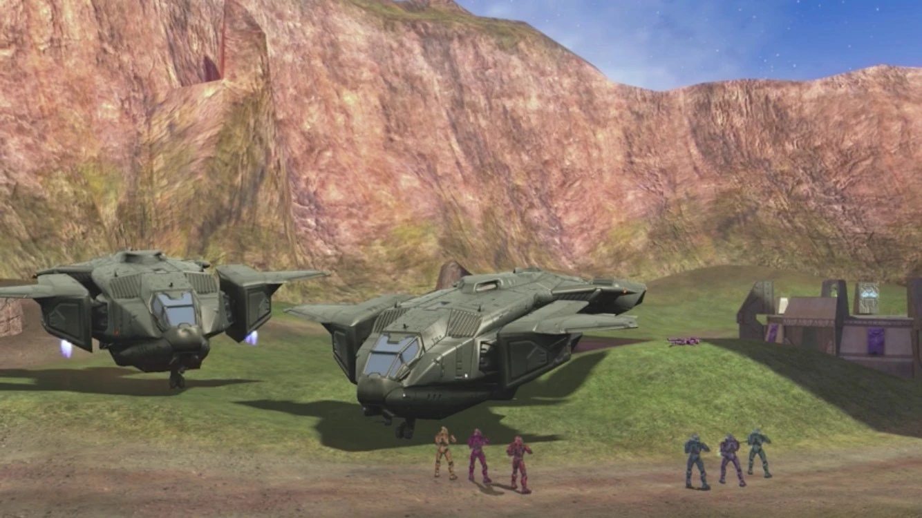 As Sarge speaks, the Pelican flies over onto the over side of the first pelican and parks.