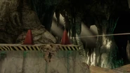 The sword's heat begins to melt away the ice. Cut to the group falling into a tunnel.
