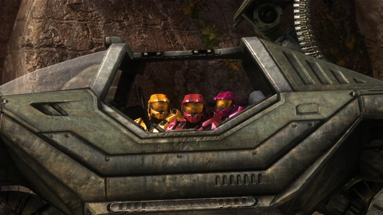 Carolina passes by a Warthog. The Reds poke out from behind it after she's gone