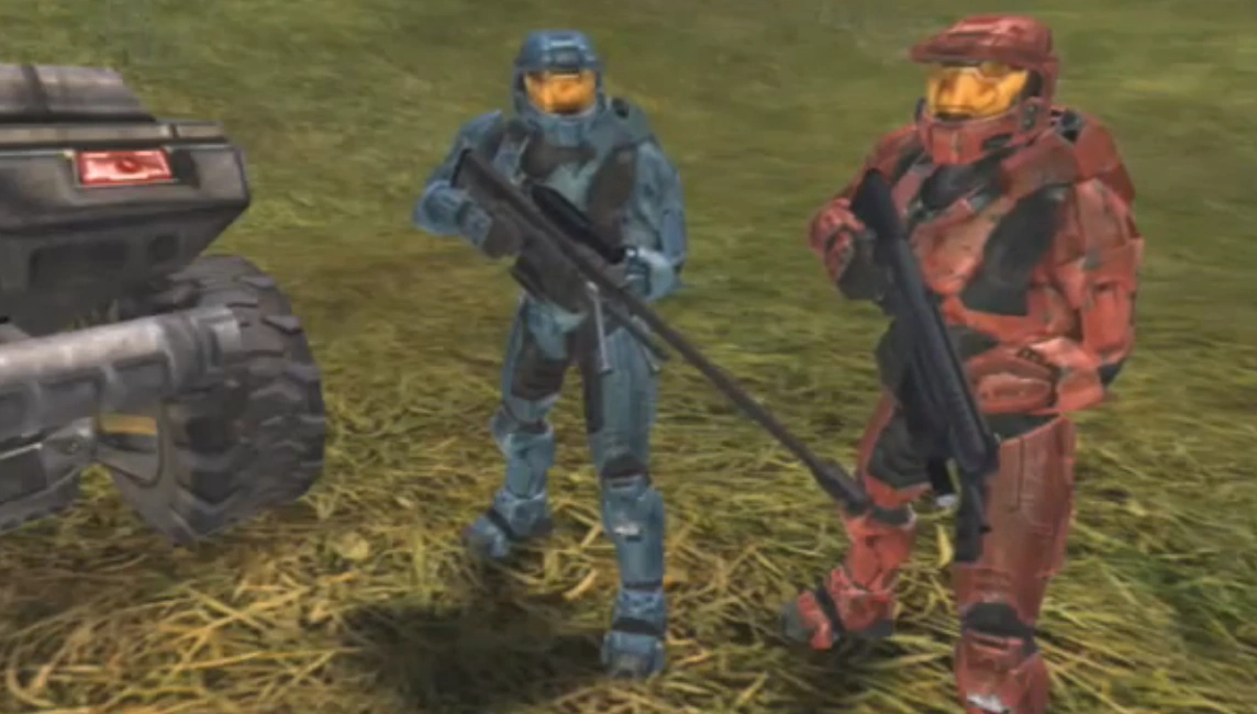 Simmons runs up to the jeep turret as Grif gets back up, after Sarge hits him in the ribs with the end of his shotgun once for good measure