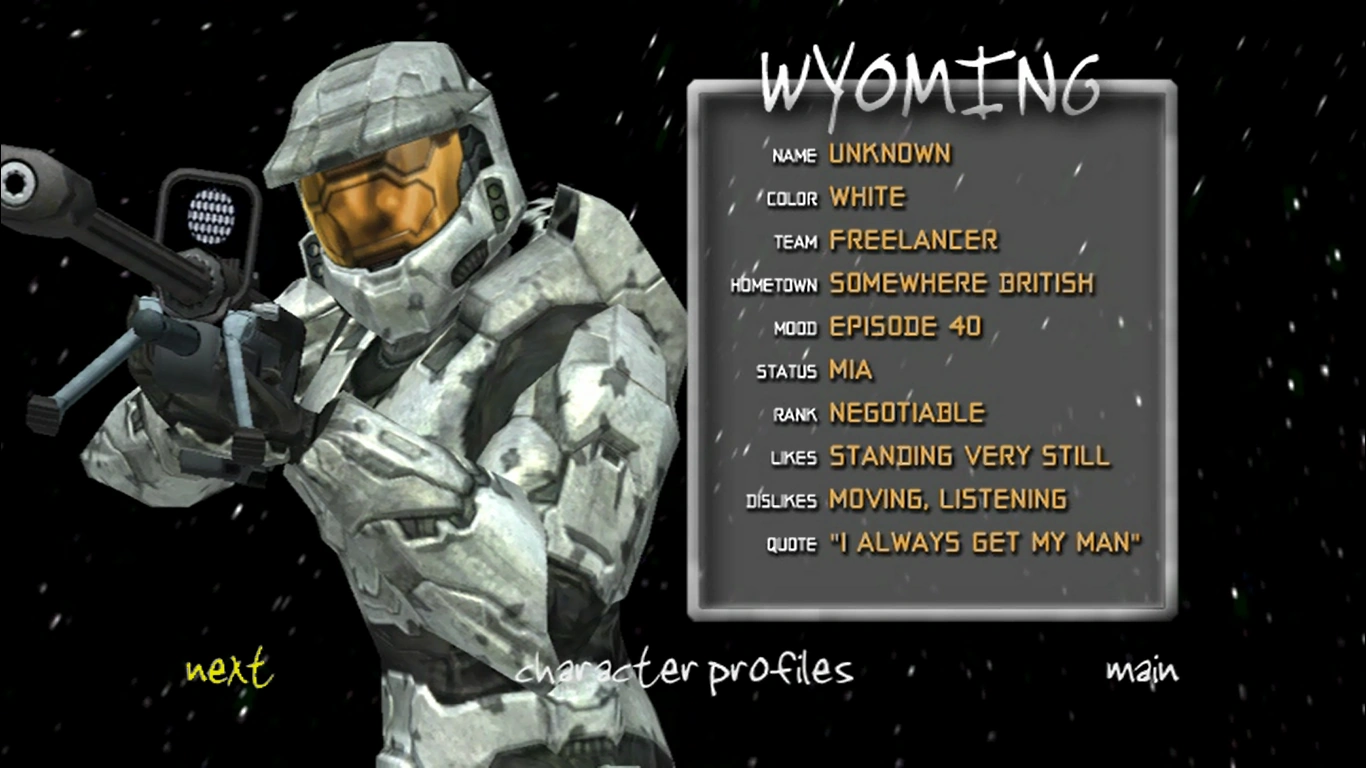 Much later, when Carolina attempted to access the Jungle Temple located on Planet Chorus, its A.I. Custodian presented her with illusions of her former Freelancer allies, with Wyoming appearing among them.